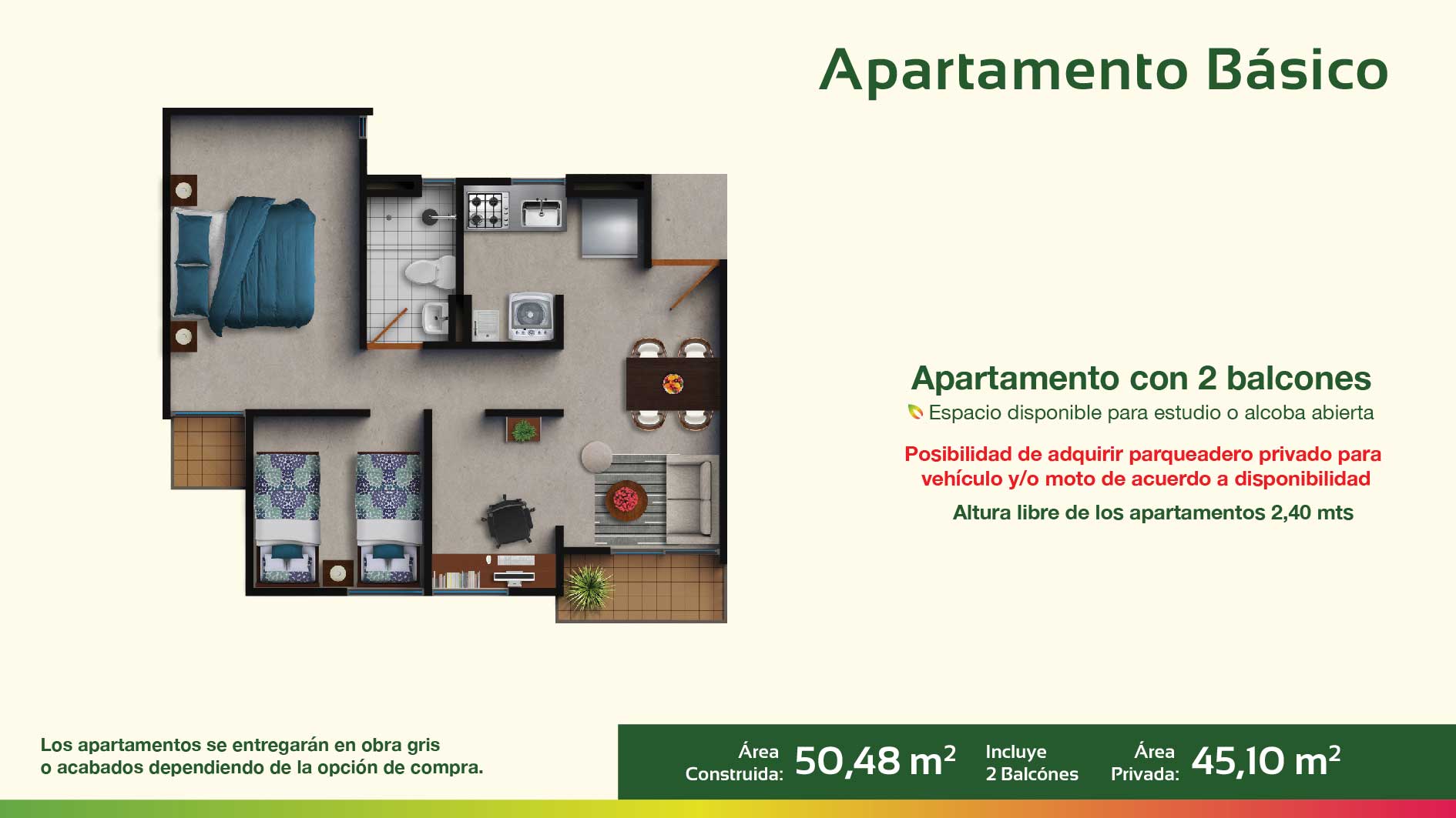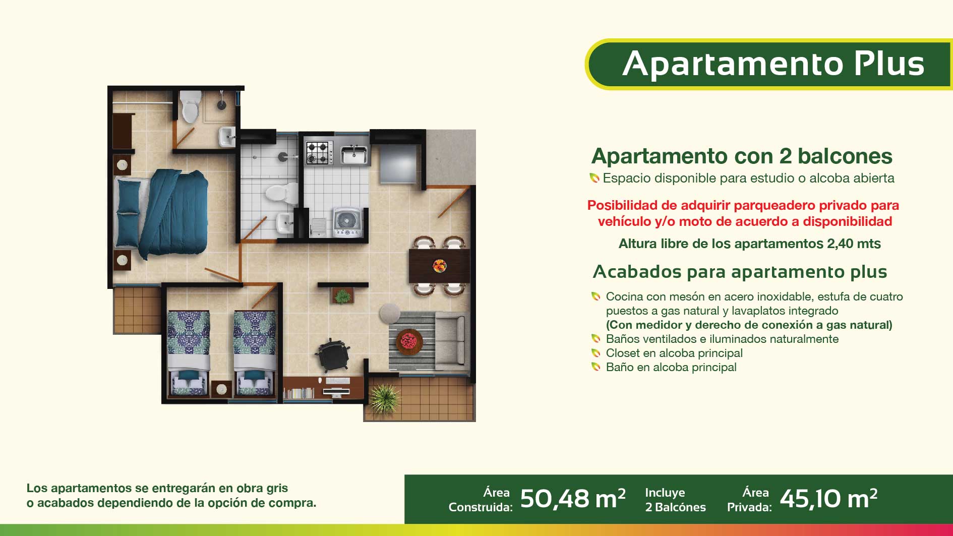 El proyecto consta de 320 apartamentos en conjunto cerrado con cerramiento en cerca viva, distribuidos en 16 torres de 5 pisos de altura – 4 apartamentos por piso.